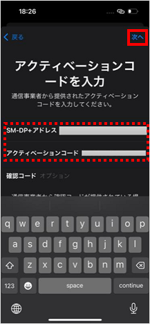 手順3で表示したブラウザで「SM-DP+アドレス」と「アクティベーションコード」をそれぞれコピーして、「SM-DP+アドレス」と「アクティベーションコード」欄に貼り付けてください。