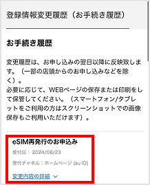 My UQ mobile(Web)の「登録情報変更履歴(お手続き履歴)」にてご確認いただけます。 登録情報変更履歴(お手続き履歴)はこちら