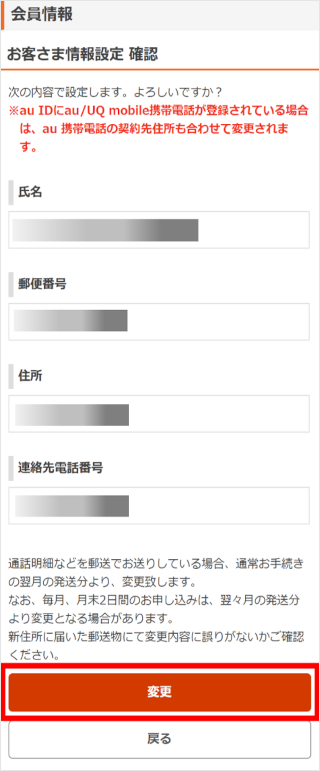 回線契約の契約者情報の変更手続きを行うことで、au IDの氏名/住所も変更されます。