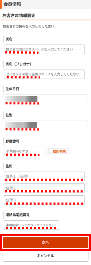 ※「郵便番号」を入力し、[住所検索]をタップすると「住所1」に検索結果が設定されます。