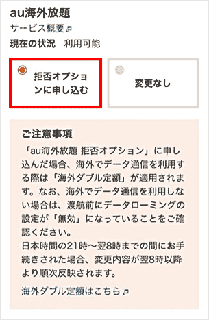「海外ダブル定額」のご利用をご希望の場合は、「au海外放題拒否オプション」をお申し込みください。