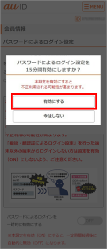 パスワードによるログインを15分間有効にしました。