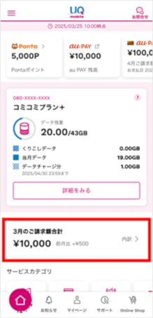 My UQ mobile(アプリ)の「お支払い状況の確認/お支払い」で確認できます。