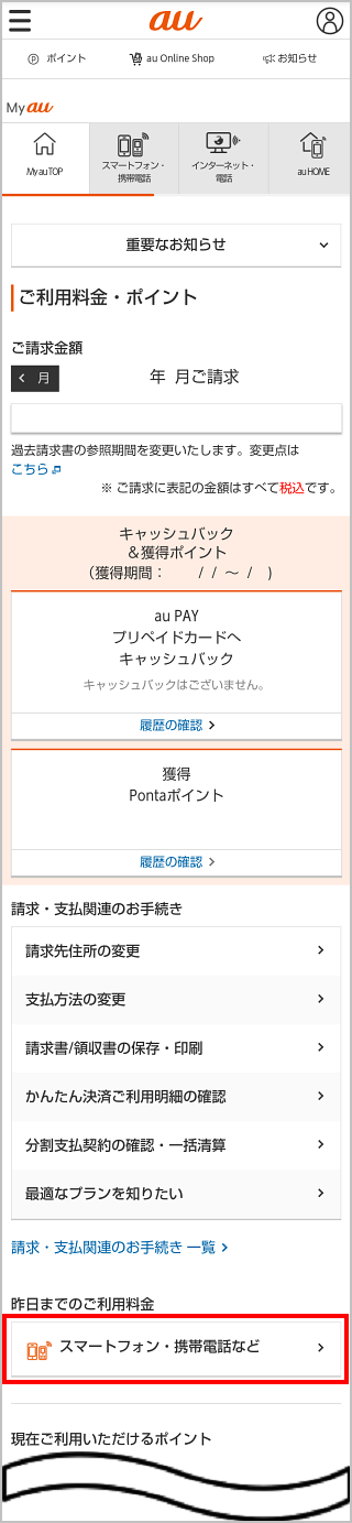 My UQ mobileのTOP画面を下にスクロールし、「昨日までのご利用料金」の項目の[スマートフォン・携帯電話など]をタップします。