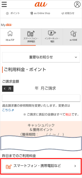 「昨日までのご利用料金」の項目の[スマートフォン・携帯電話など]をタップします。