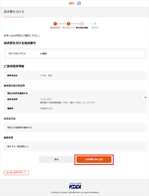 請求書の送付先住所/お支払方法/紙請求書(有料)の発行有無をそれぞれ選択し、[次に進む]をタップします。