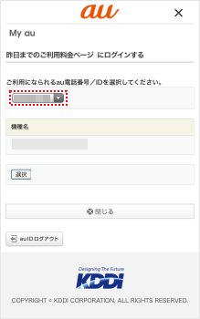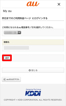 UQ mobile電話番号/auひかりなどの契約番号を選んだ上で、[選択]をタップします。