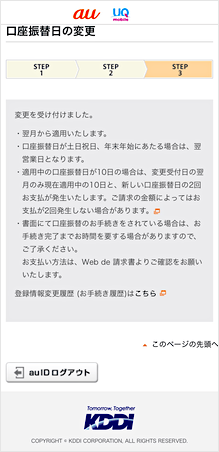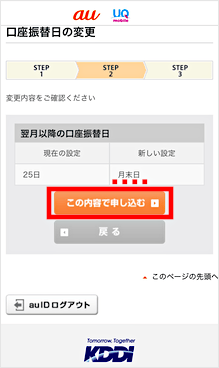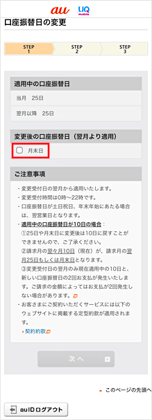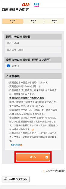 口座振替日を変更したいUQ mobile電話番号/auひかりなどの契約番号を選択します。