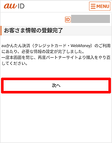 「au PAY(auかんたん決済)」のお客さま情報の登録が完了したら、[次へ]をタップします。