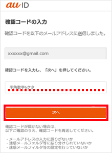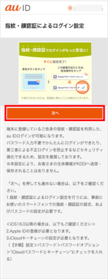 ※au IDを登録済みの場合は、au IDを入力して[次へ]をタップし、ログインを行ってください。その後、手順15へ進みます。