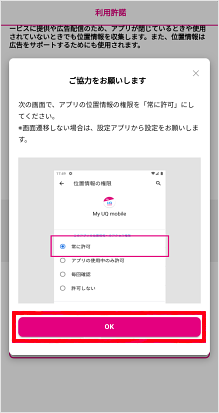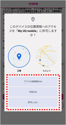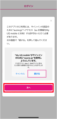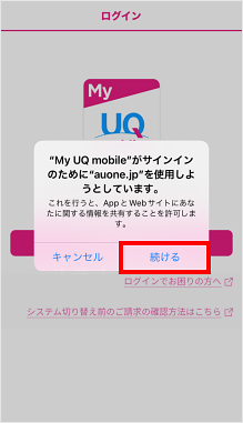 「My UQ mobileアプリ」を初めて起動した際は、au IDなどの初期設定が必要です。