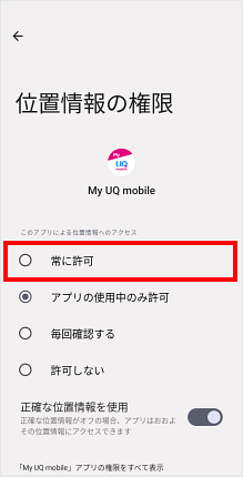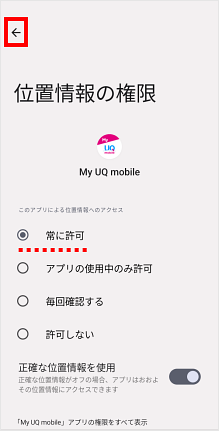 「常に許可」にチェックが入ったのを確認し、[←]をタップします。