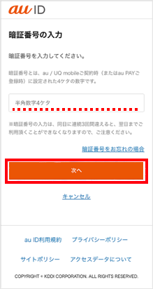 4桁の暗証番号を入力し、[次へ]をタップします。