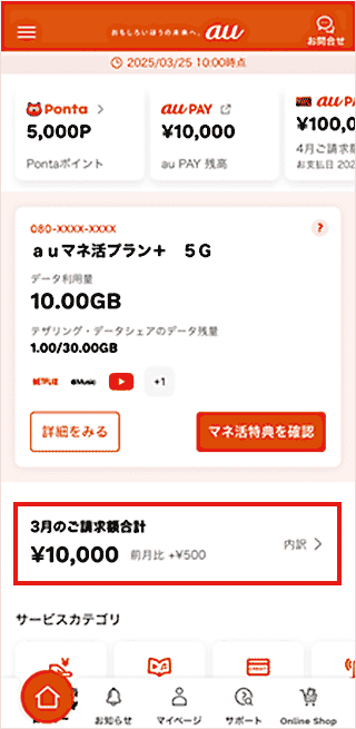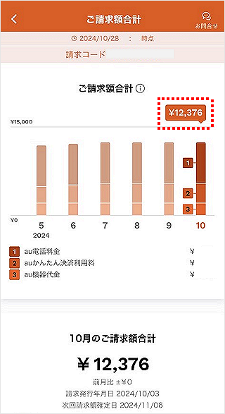 「○月のご請求額合計」に当月の請求額の合計が表示されます。 [○月のご請求額合計]をタップすると請求内訳や過去の請求金額をご確認いただけます。