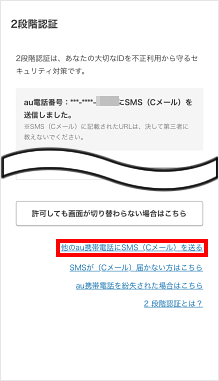 メールアドレスにも2段階認証が届いていない場合は、以下の「別のau携帯電話に2段階認証を送る」の操作をお試しください。