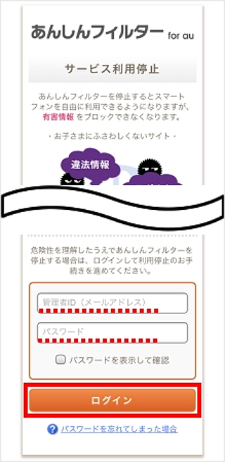 「あんしんフィルター for au」のご利用停止(解除)は、「お子さまの端末」でお手続きができます。