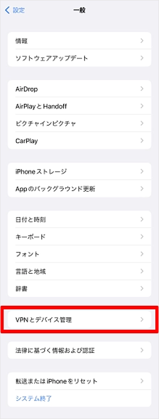 一般メニュー画面を下部にスクロールし、[VPNとデバイス管理]をタップします。