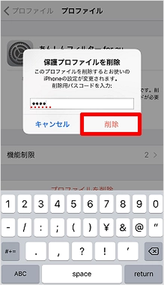 「あんしんフィルター for au」利用開始時に設定した「削除用パスコード(4文字の半角数字)」を入力し、[削除]をタップします。