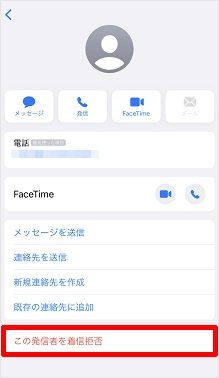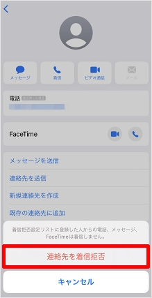 [連絡先を着信拒否]をタップします。以上で着信拒否設定は完了です。