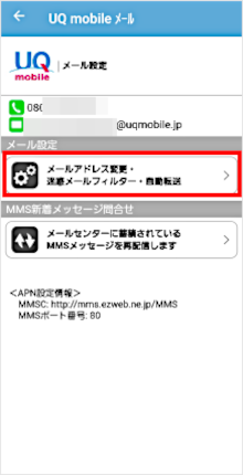 [メールアドレス変更・迷惑メールフィルター・自動転送]をタップします。