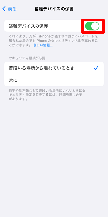[盗難デバイスの保護]のスイッチをタップしてオフにします。