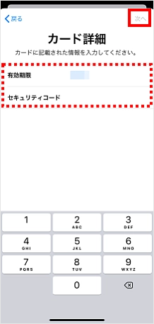 「有効期限・セキュリティコード」を入力し、[次へ]をタップします。