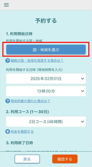 「1.利用開始日時」の[国・地域を選ぶ]をタップします。