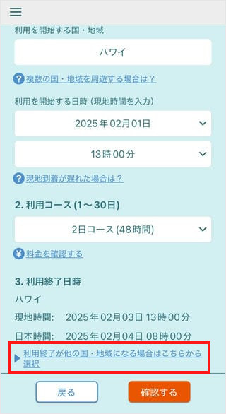 画面を下にスクロールし、「3.利用終了日時」の[利用終了が他の国・地域になる場合はこちらから選択]をタップします。