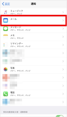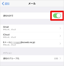 [通知を許可]のスイッチをタップしてオフにします。 ※メールアカウントごとに通知を設定するには、[通知を許可]のスイッチをオンにした状態で、メールアカウントを選択するとメールアカウントごとに通知の詳細設定ができます。
