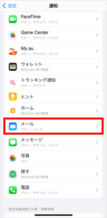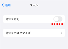 [通知を許可]のスイッチをタップしてオフにします。 ※「通知を許可」をオンにした状態で、ロック画面・通知センター・バナーに表示させるかをそれぞれ選択したり、「通知をカスタマイズ」でメールアカウントごとに通知の設定をすることもできます。