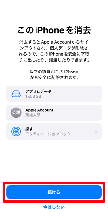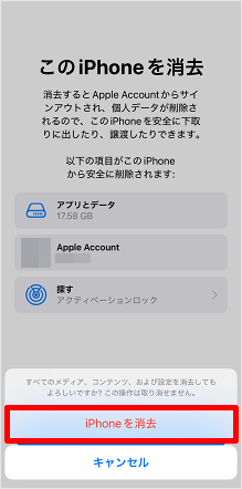 端末の「探す」機能がオフになっていれば、どちらかをタップするとすぐにリセットが開始します。