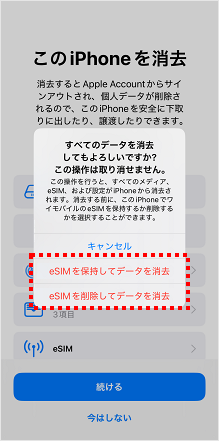 初期化後も端末を利用する場合は、[eSIMを保持してデータを消去]をタップします。eSIMを削除した場合、eSIM再発行の手続きが必要になるためご注意ください。