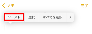 貼り付けたい文字入力欄(メール/メモなど)でカーソルを軽くタップし、ペーストをタップすると貼り付けることができます。