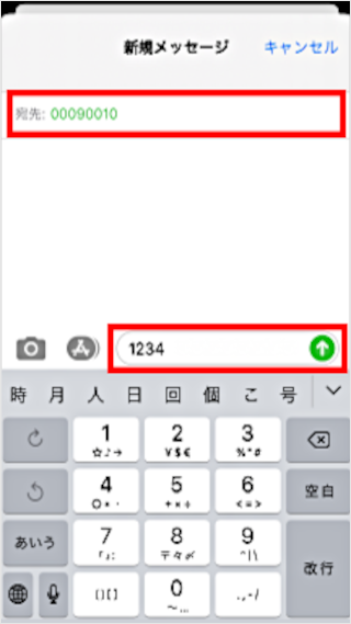 宛先に「00090010」、本文に「1234」と入力し、[↑]をタップして送信します。