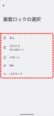 「画面ロックの選択」画面になります。 こちらの画面で、画面ロックの設定・変更・解除ができます。