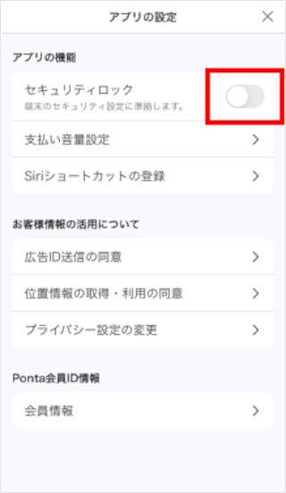 「セキュリティロック」のスイッチをタップしてオンにします。