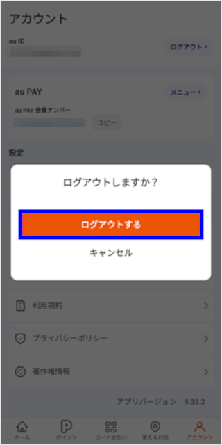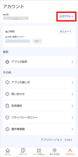 au PAY アプリを一度ログアウトしてから、ほかのau IDでログインできます。