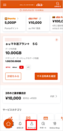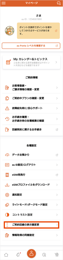 My au(アプリ)のマイページで、ご契約回線の表示順を変更できます。