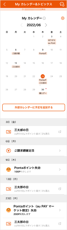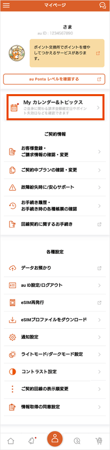 My UQ mobile(アプリ)でMyカレンダーを利用するには、My UQ mobile(アプリ)のマイページで「Myカレンダー&トピックス」をタップします。