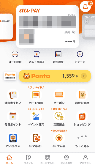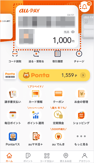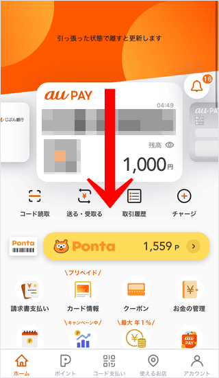 au PAY アプリのホーム画面の情報は、アプリを開いて画面を下に引っ張って離すと更新されます。