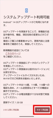 [今すぐ再起動]をタップすると端末が再起動され、アップデートが開始します。