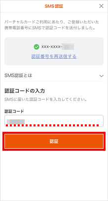 SMSで6桁の「認証コード」が送信されます。 「認証コード」を入力して、[認証]をタップします。