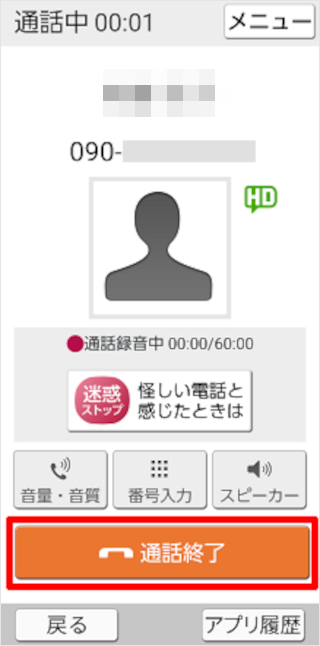 通話画面で[通話終了]をタップすると、電話を切ることができます。