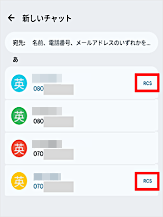 RCSでの送信となる場合、メッセージの送信相手を選択する際に「RCS」が表示されます。