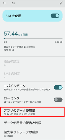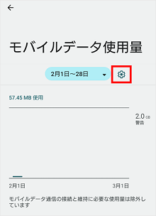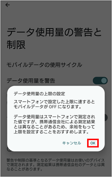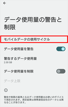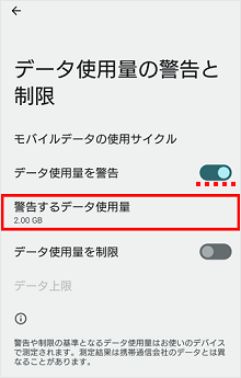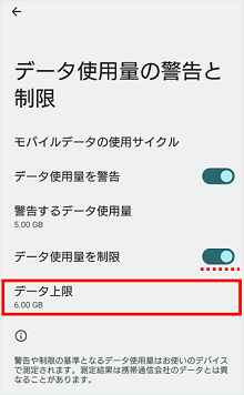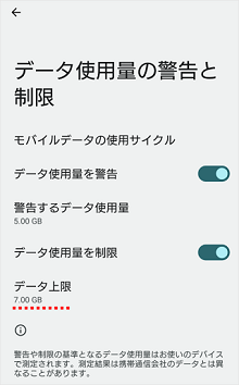 ※「データ警告」は設定した値にデータ通信量が達すると警告通知が表示される機能です。上限設定する値の少し手前の値にすることをおすすめします。