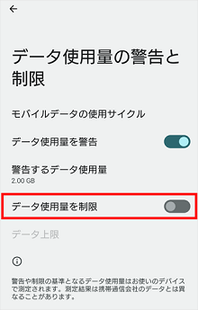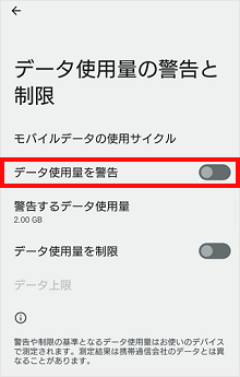 ※警告設定や上限設定をやめたい場合は、「データ使用量を警告」「データ使用量を制限」をオフにしてください。