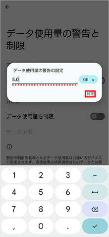 データ使用量の警告を出したい値を入力し、[設定]をタップします。