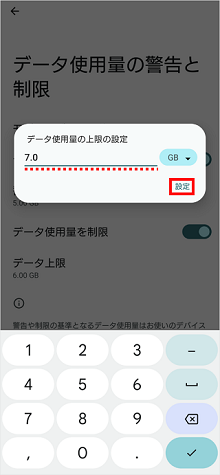 データ通信量の上限にしたい値を入力し、[設定]をタップします。