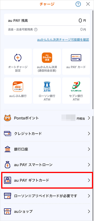 au PAY アプリを起動し、チャージ画面で「au PAY ギフトカード」を選択してチャージします。