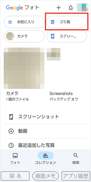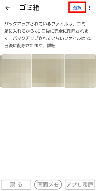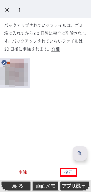 削除したい写真や動画にチェックをついていることを確認し、[復元]をタップすると、操作は完了です。